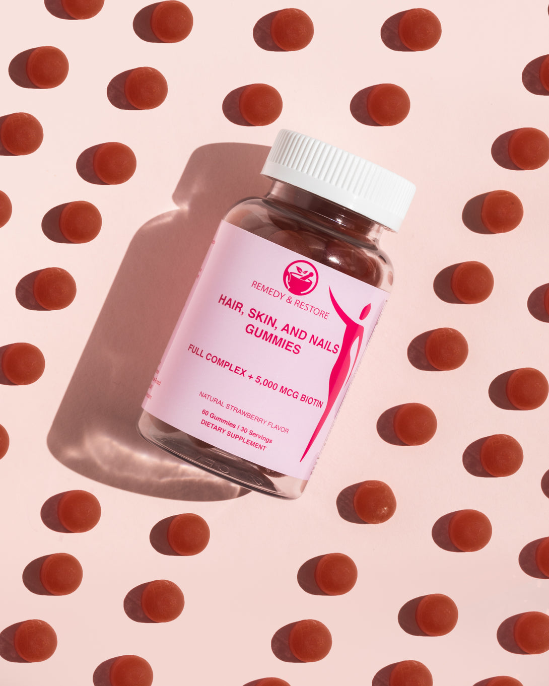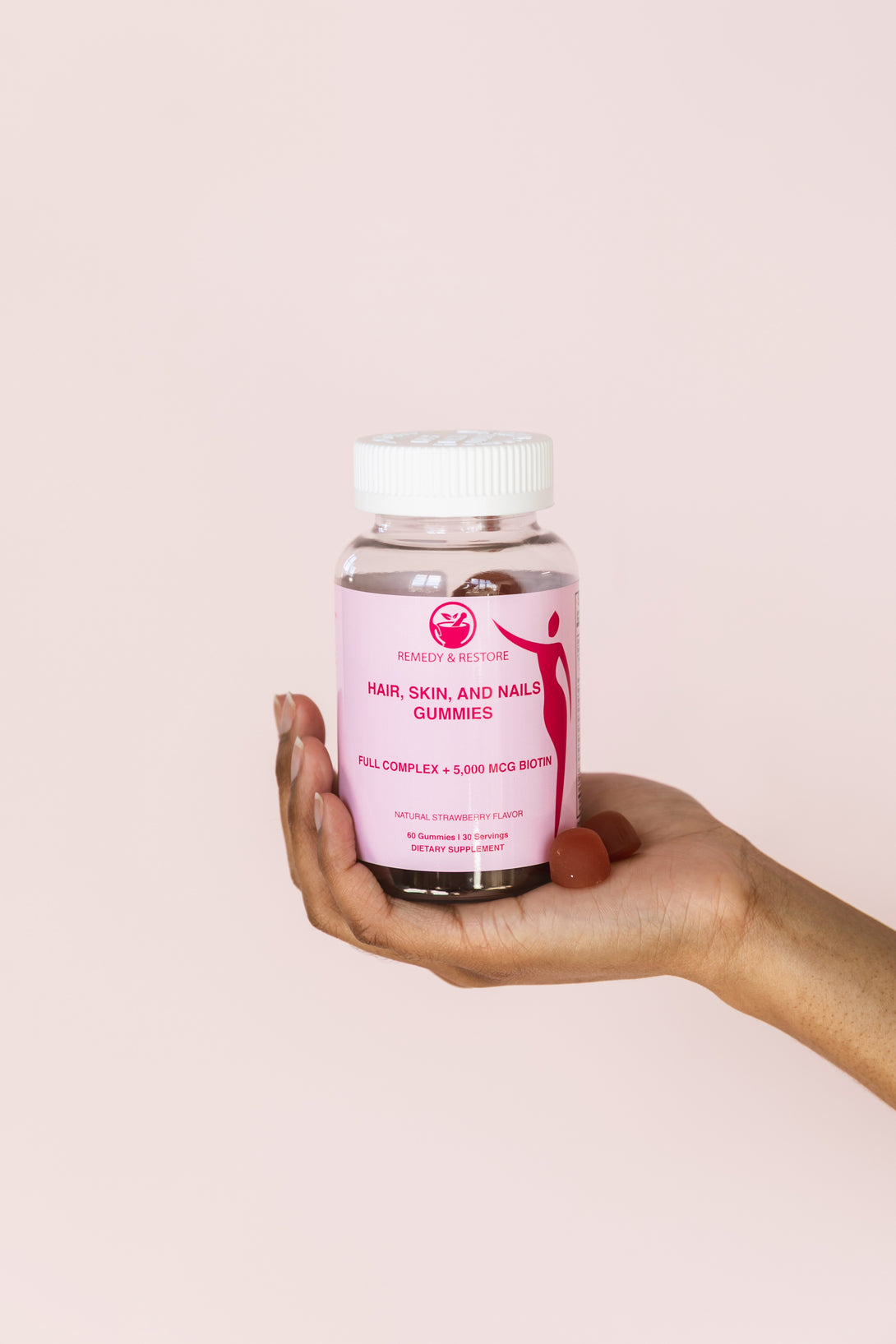 Achieve radiant hair, glowing skin, and strong nails with Remedy & Restore Hair, Skin, and Nails Gummies—your ultimate beauty-boosting supplement! Packed with 5,000 mcg of Biotin, essential vitamins, and minerals, this delicious strawberry-flavored gummy is designed to support your natural beauty from the inside out.